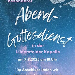 Wir laden Sie herzlich zu einem besonderen Abendgottesdienst am 07.09.2025 um 18 Uhr in der Lüdersfelder Kapelle ein.